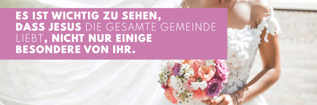 Man könnte eigentlich fragen: was findet Jesus nur an all den Gemeinden so toll? Die Antwort mag simpel klingen. Sie verändert jedoch in ihrer Tragweite unseren eigenen Blick auf Gemeinde. Jesus liebt seine komplette Braut, nicht wegen dem, wie sie ist oder was sie getan hat, sondern wegen dem, was Er für sie wurde und Er für sie getan hat (vgl. Eph 5,25-27). Er sieht die komplette Braut ohne Runzeln und Flecken. Keine Unvollkommenheit kann Er an irgendeiner Stelle feststellen, weil Er sie mit seiner eigenen Schönheit kleidet.